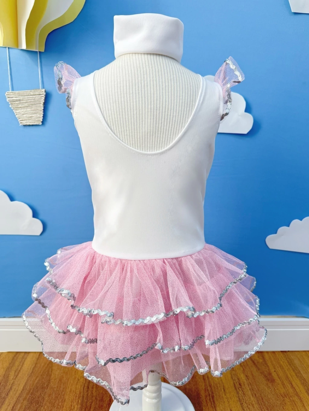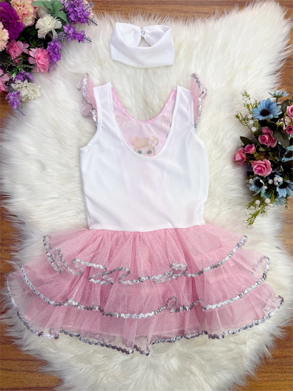 Acabamentos: Cianinha prata nas camadas da saia, flor decorativa na cintura